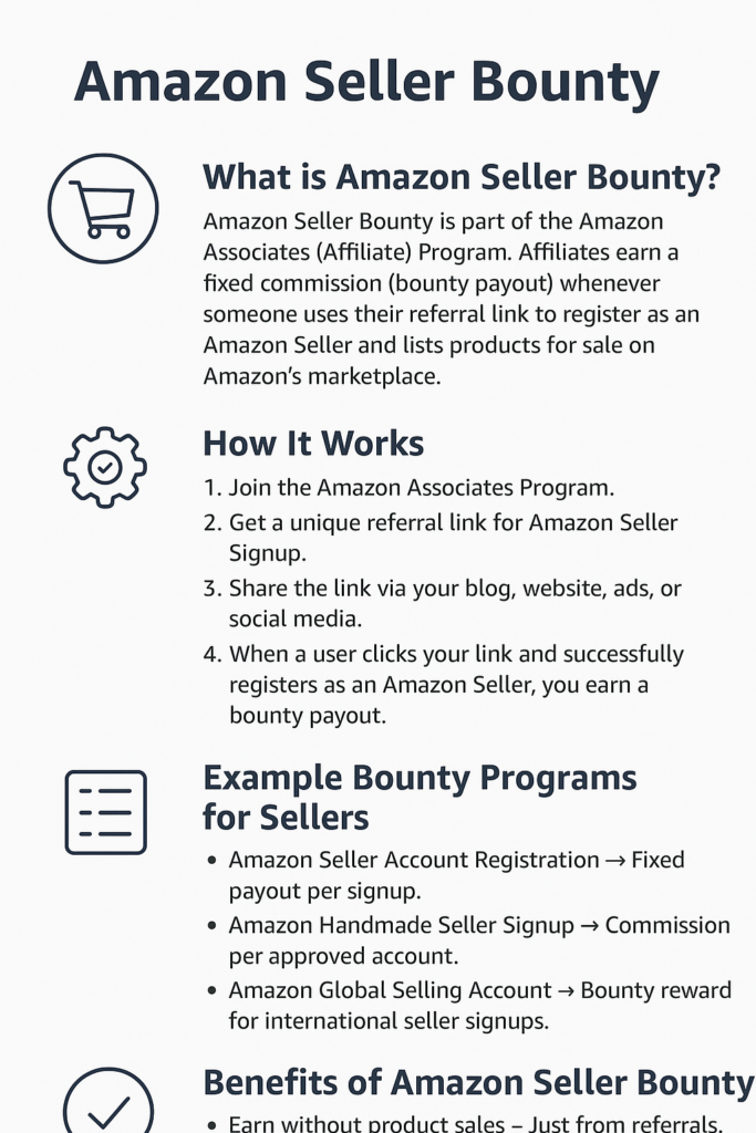 Amazon Seller Bounty is part of the Amazon Associates (Affiliate) Program. Affiliates earn a fixed commission (bounty payout) whenever someone uses their referral link to register as an Amazon Seller and lists products for sale on Amazon’s marketplace.